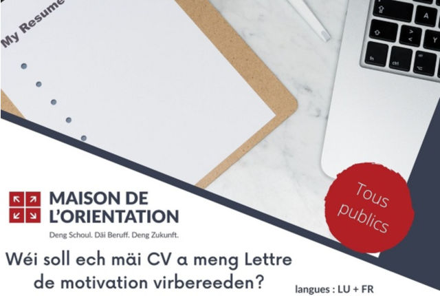 The content of this page is not available in English Vous voulez postuler pour un nouvel emploi ou bien vous êtes à la recherche de votre premier stage ou travail? Alors un bon CV et une lettre de motivation structurée et convaincante sont la base pour une candidature qui se démarque de celle des autres candidats! Lors de notre atelier, vous recevrez un bon nombre d'astuces qui vous permettent d'élaborer un dossier de candidature qui sorte du lot - profitez-en!