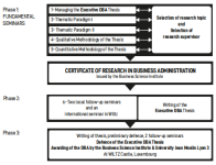 Le programme est structuré en trois phases. Dans la première phase, vous compléterez cinq modules complets, soit en personne soit en ligne, conçus pour vous équiper des compétences et des connaissances essentielles à la réussite de votre DBA. Une fois cette phase achevée avec succès, vous passerez aux phases deux et trois, en vous concentrant sur votre thèse.