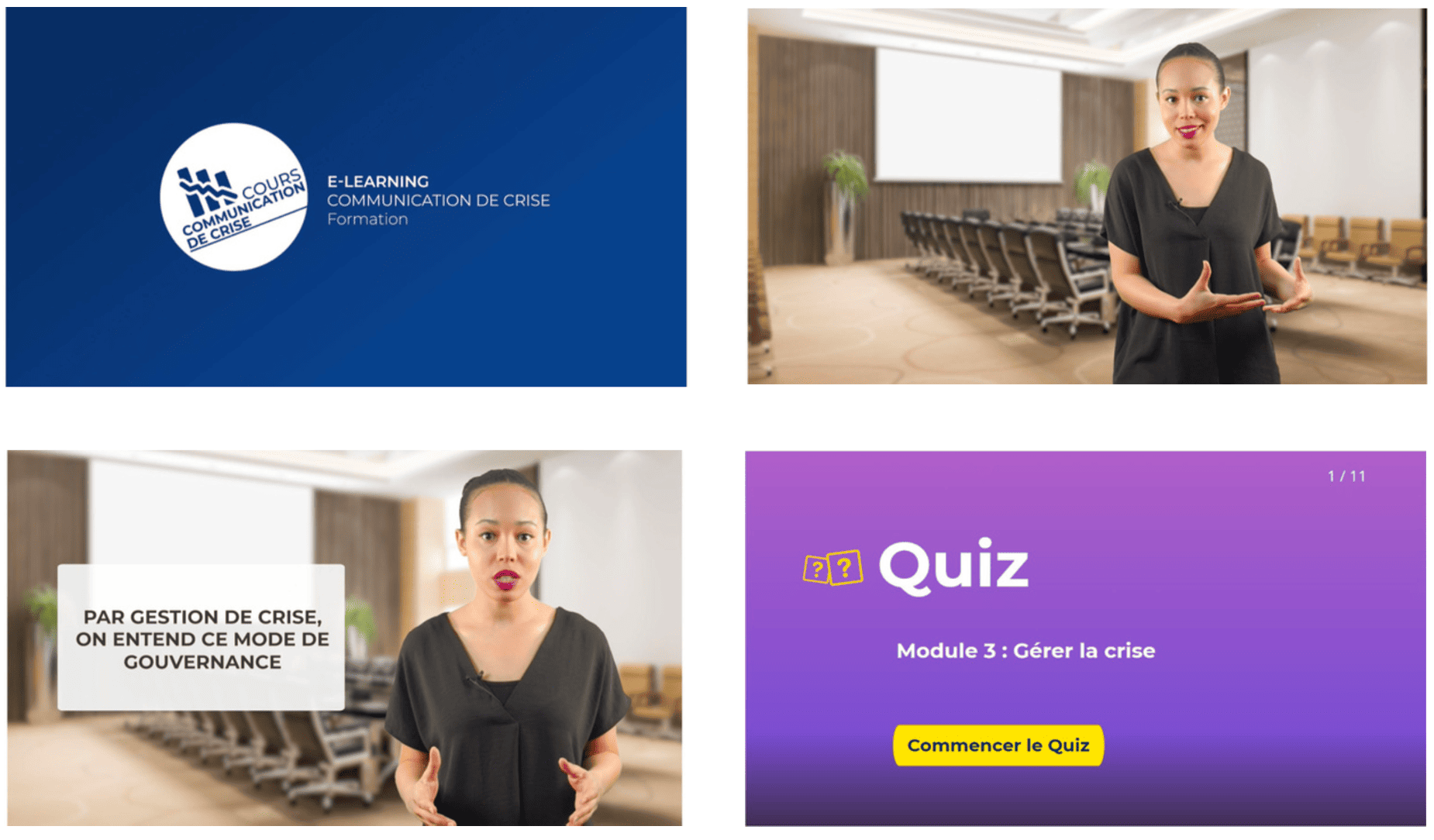 Vidéos explicatives, modules e-learning scénarisés, études de cas, exercices interactifs, quiz intermédiaires et mises en situation favorisant l’analyse et la prise de décision en contexte de crise.