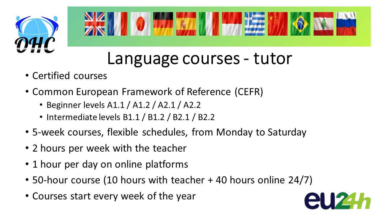 Cours de 5 semaines, horaires flexibles, du lundi au samedi2 heures par semaine avec le professeur1 heure par jour sur les plateformes en ligneCours de 50 heures (10 heures avec le professeur + 40 heures en ligne 24h/24 et 7j/7)